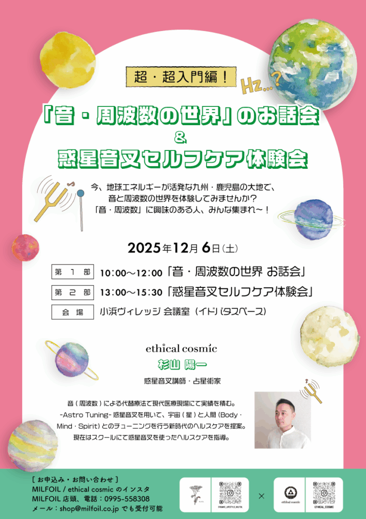 今回は、「音・周波数・惑星音叉」についての超・超入門編ですので、老若男女どなたでも大歓迎です。