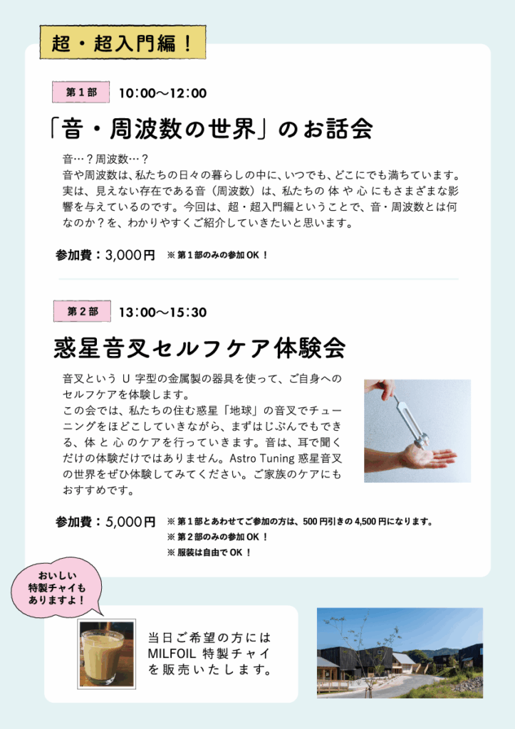 ※第2部 惑星音叉セルフケア体験会は楽な服装でお越しください